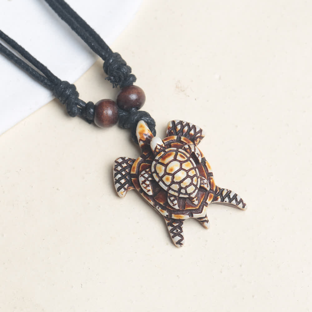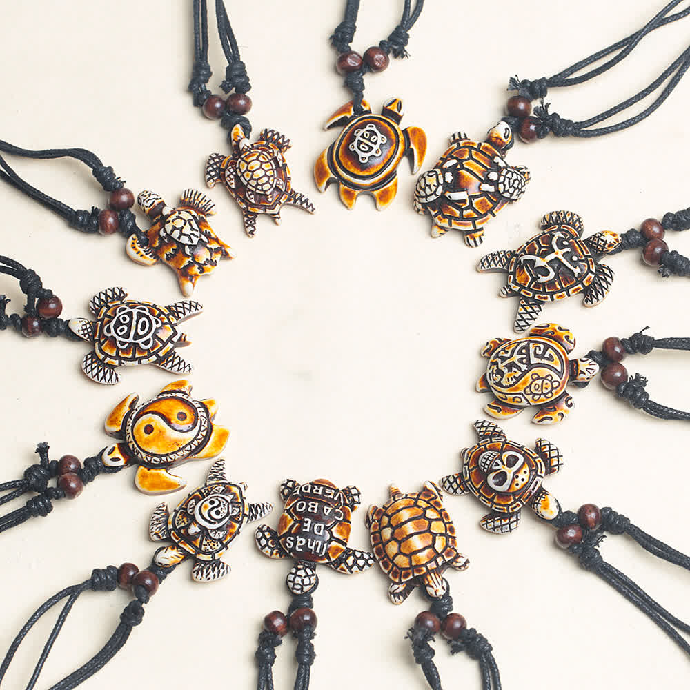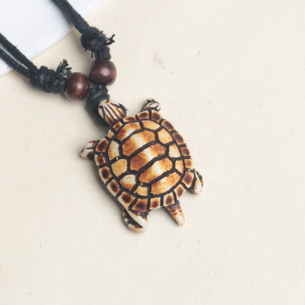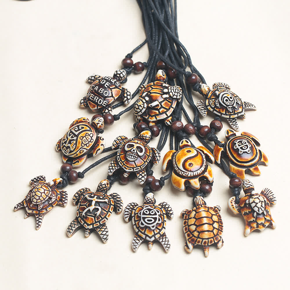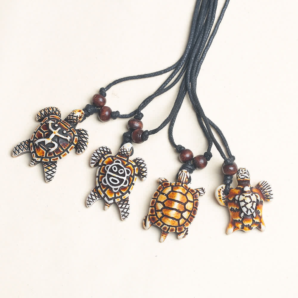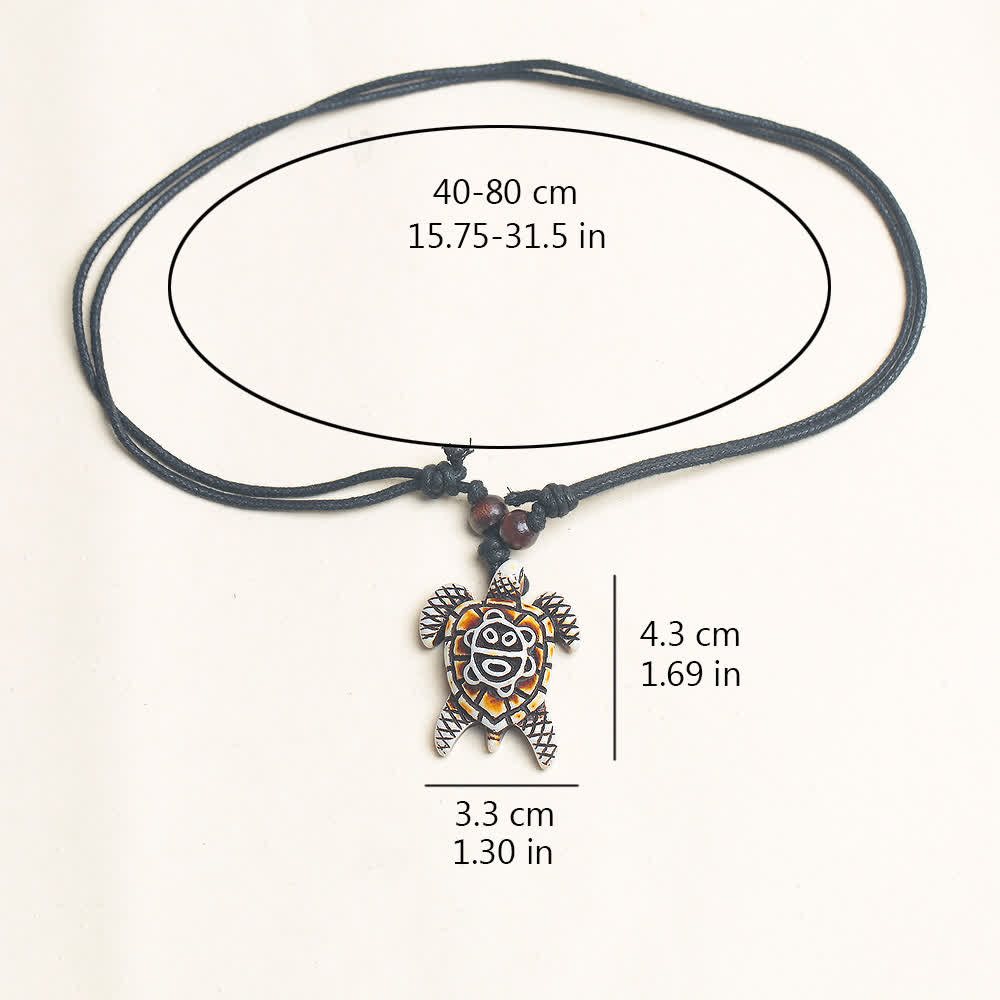 - Hand - crafted with care, the turtles are adorned with unique patterns, some inspired by ancient symbols, others by nature's beauty. Suspended from sturdy black cords with wooden beads, these necklaces are not just accessories but talismans. Wear one to carry the spirit of the turtle with you, a reminder to move forward with patience and grace in every step of your life's adventure.