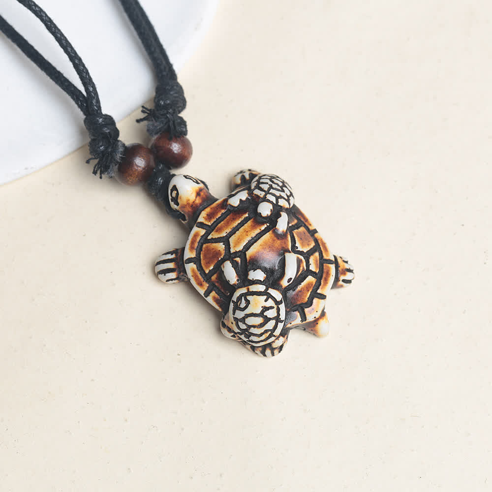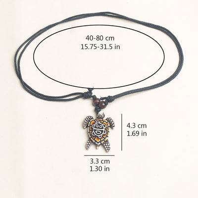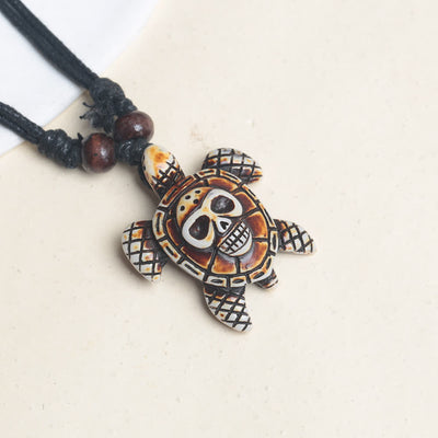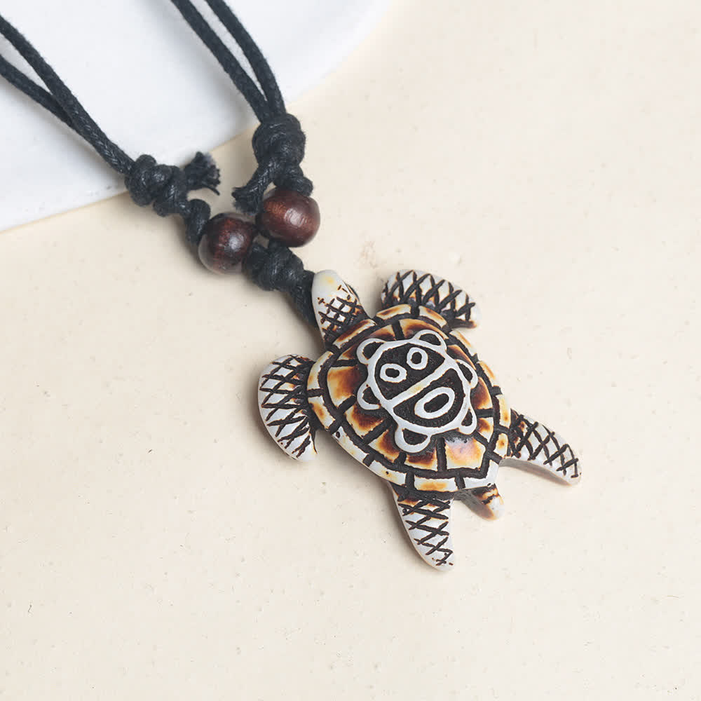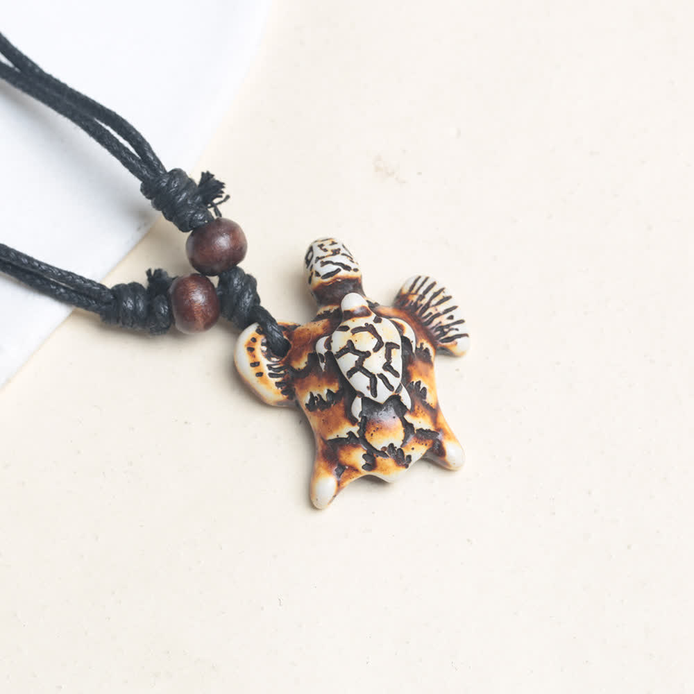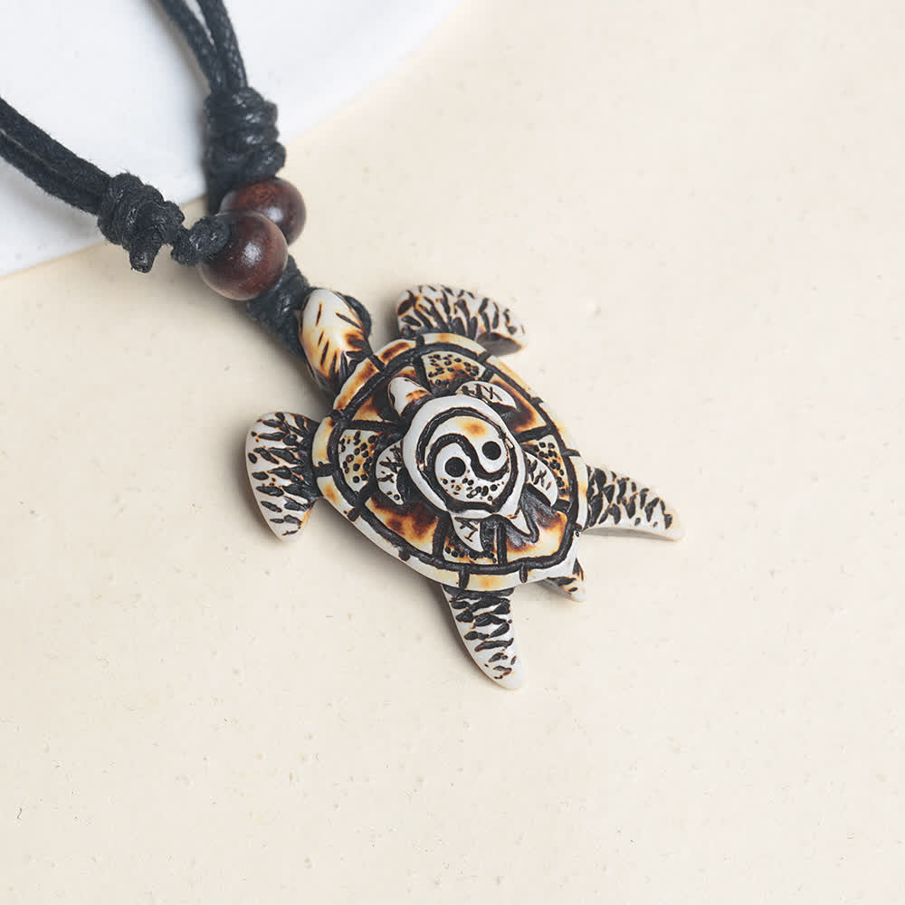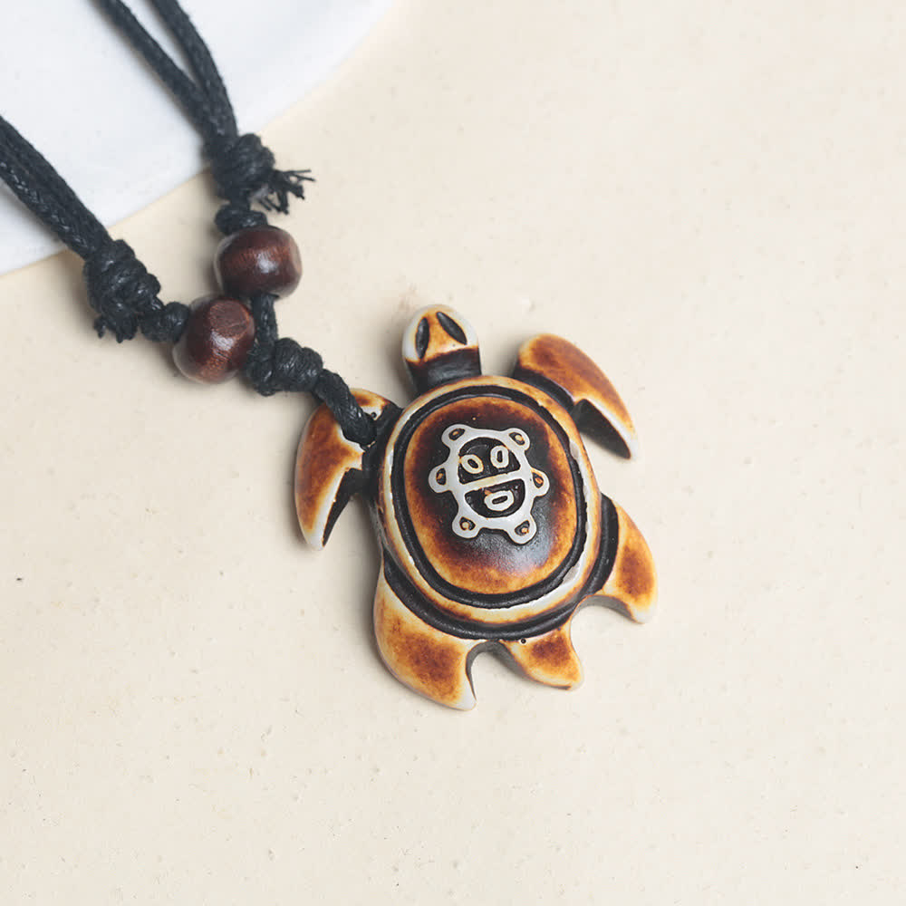 - Hand - crafted with care, the turtles are adorned with unique patterns, some inspired by ancient symbols, others by nature's beauty. Suspended from sturdy black cords with wooden beads, these necklaces are not just accessories but talismans. Wear one to carry the spirit of the turtle with you, a reminder to move forward with patience and grace in every step of your life's adventure.